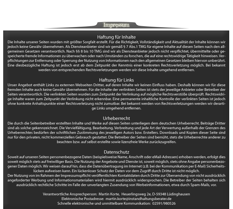 Wer Hilfestellung beim Kauf einer Immobilie benötigt oder sachkundige Hilfe bei Immobilienfragen oder gar ein Gutachten bei Schäden an Gebäuden braucht, der darf sich gerne an uns wenden. Wir beraten bei vielen Immobilienfragen sowie zum Arbeits- und Gesundheitsschutz sowie zum betrieblichen Brandschutz. Unsere Website mit Informationen findet Ihr unter: www.instandhaltungsberater.de