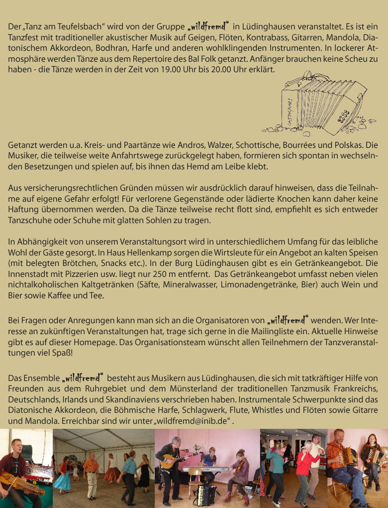 Interessenten können im Laufe des Tanzabends in Abstimmung mit dem Veranstalter spontan mitwirken. Wir spielen nur traditionelle Stücke sowie moderne Stücke, die nicht dem Urheberrechtsabgabenzwang der GEMA unterlagen. Honorare zahlen wir nur an geladene Gastmusiker nach vorheriger schriftlicher Abstimmung.