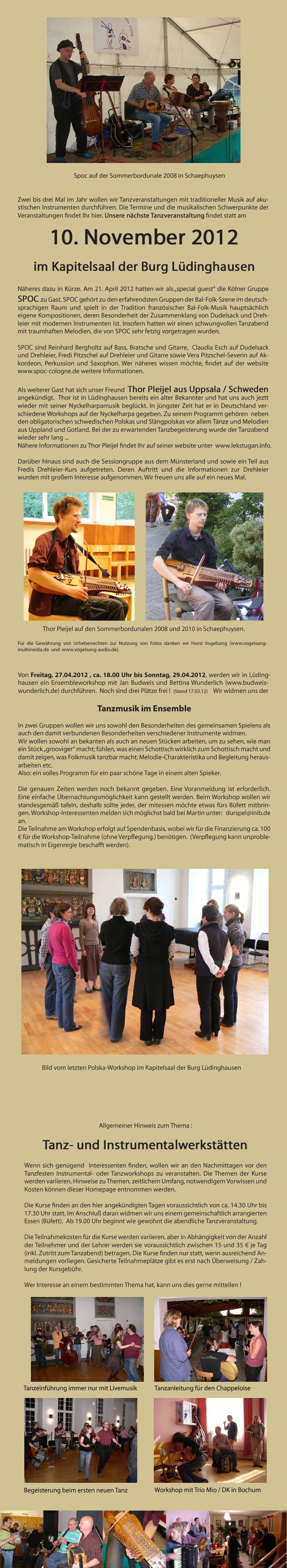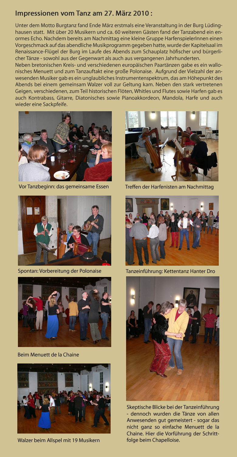 Es war eine spannende Veranstaltung mit Musik auf Nyckelharpa, Drehleier, Dudelsack, Akkordeon, Gitarre, (Quer-) Flöten, Saxophon, Kontrabass, Geige und ... xy sowie natürlich mit Gesang. Der Auftakt erfolgte um 19.00 Uhr mit einer Poloness im Burghof (bei gutem Wetter), die unsere Mitstreiterin Monika Gottwald anführte um uns anschließend in den Kapitelsaal zu geleiten. Danach folgten im Laufe des langen Abends - bis in den Mai hinein - viele nord-, west- und osteuropäische Tänze in der Tradition französischer Bal-Folk-Musik sowie zwischendurch irischer Steptanz als Kurzeinführung. Die sonst übliche Tanzeinführung um 19.00 Uhr entfällt.