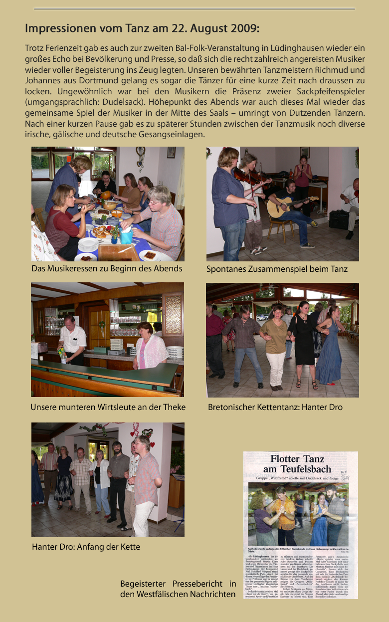 Zwei bis drei Mal im Jahr wollen wir Tanzveranstaltungen mit traditioneller Musik auf akustischen Instrumenten durchführen. Eine fest etablierte Veranstaltung ist dabei der Tanz in den Mai am 30. April sowie tags darauf das Tanzen und das Aufspielen an einem Maibaum, zum Beispiel in Ondrup. Die sonstigen Termine (meist im Oktober oder November) und die musikalischen Schwerpunkte der jeweiligen Veranstaltungen findet Ihr hier.